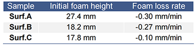 上表是三個表面活性劑在相同的攪拌速度下發泡能(néng)力的評價。表面活性劑A比表面活性劑B和C産(chǎn)生的泡沫更多(duō)。