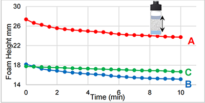 從上圖中(zhōng)可(kě)以确定泡沫的初始量和泡沫損失的速度(曲線(xiàn)的斜率),從而很(hěn)容易評估泡沫的穩定性。