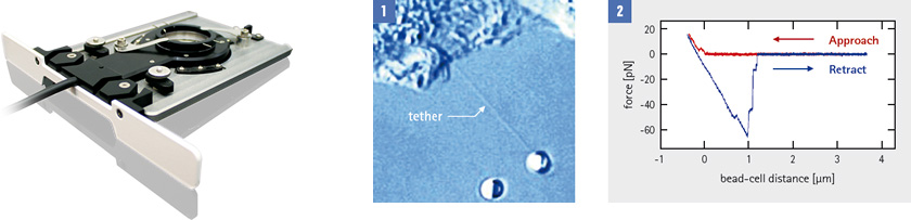 圖片顯示了用(yòng)于活細胞實驗的JPK PetriDishHeater,CHO細胞被光學(xué)捕獲的蛋白質(zhì)塗層珠子拉動[1],以及相應的力與距離圖[2]
